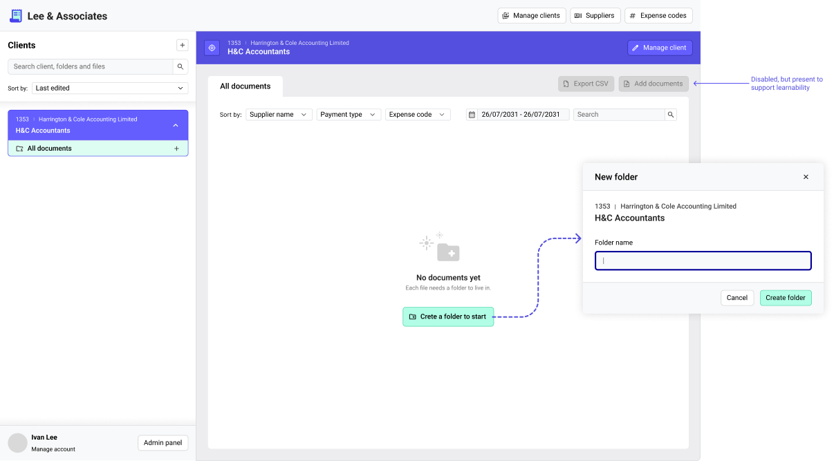 Empty state of a “new client” is interesting because the company’s workflow dictates that each documents MUST belong to a folder, yet they still need to review all the documents at once from all the existing folders.